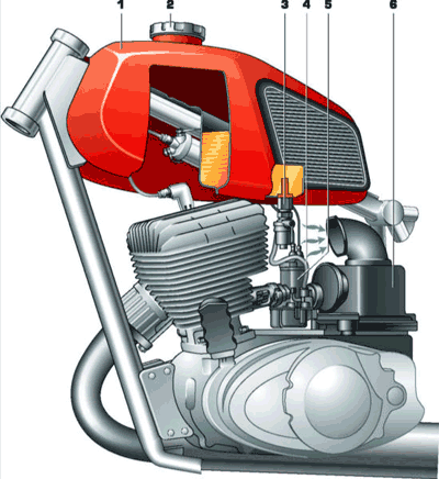 Топливо из бака подается либо самотеком, либо при помощи насоса. Оно через металлическую сетку или фильтр, кран, шланги подводится к карбюраторам или к топливнму коллектору и форсункам.